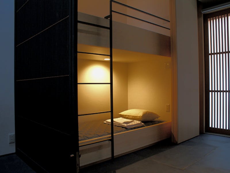 和モダンでシンプルな内装は落ち着いた古都にふさわしく、くり抜いた壁面にあつらえた2段ベッドは木戸を閉めれば視線が遮られるよう工夫されています。