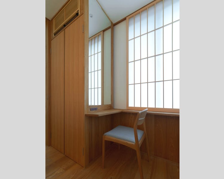 Both of the 2-bedroom apartments are light and modern yet recognizably Japanese in their use of wood, tatami and handmade paper. Facing the dining area is a feature wall that reinvents the tokonoma, the decorative alcove that serves as the focus of a traditional Japanese room.